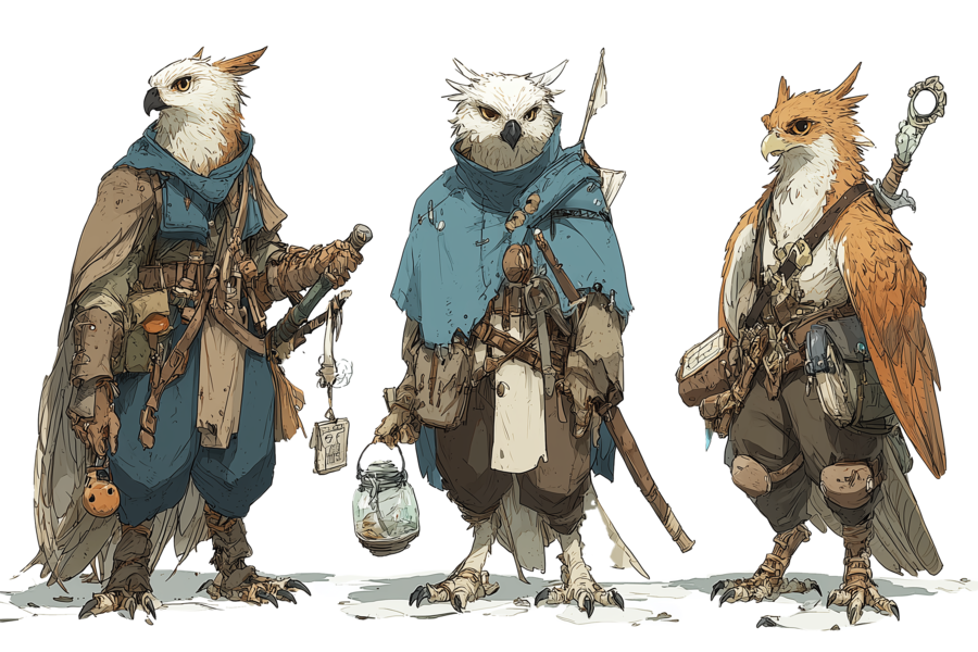 Descendants des rapaces, les Aq Auras sont de petits humanoïdes ailés au plumage varié, dotés d’une vision perçante et d’une endurance remarquable. Leur légèreté leur permet de voler sur de courtes distances, tandis que leur fierté naturelle les pousse à exceller dans les domaines intellectuels et scientifiques.