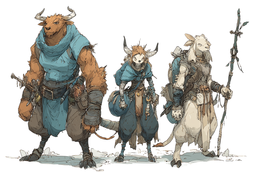 Issus des grands bovins, les Borauras sont des humanoïdes massifs à la force colossale et à la stature imposante. Calmes et pacifiques par nature, ils valorisent la sagesse et la maîtrise de soi, bien que certaines tribus guerrières perpétuent encore leurs anciennes traditions de combat. Leurs cornes, symboles de fierté et de statut, occupent une place centrale dans leur culture.