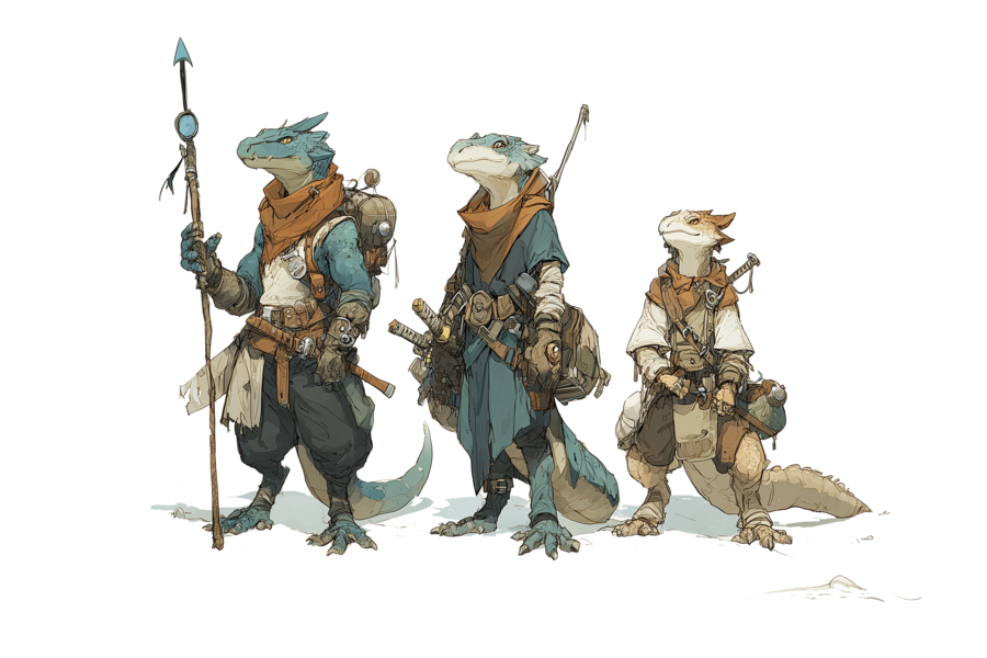 Humanoïdes reptiliens issus des sauriens, les Saurauras présentent une grande diversité de tailles et de morphologies, allant du frêle lézard au massif crocodilien. Leur peau écailleuse et leur endurance en font des êtres parfaitement adaptés aux milieux humides et maritimes. Calmes et d’une patience déconcertante, ils dissimulent leurs émotions derrière un flegme presque inébranlable.